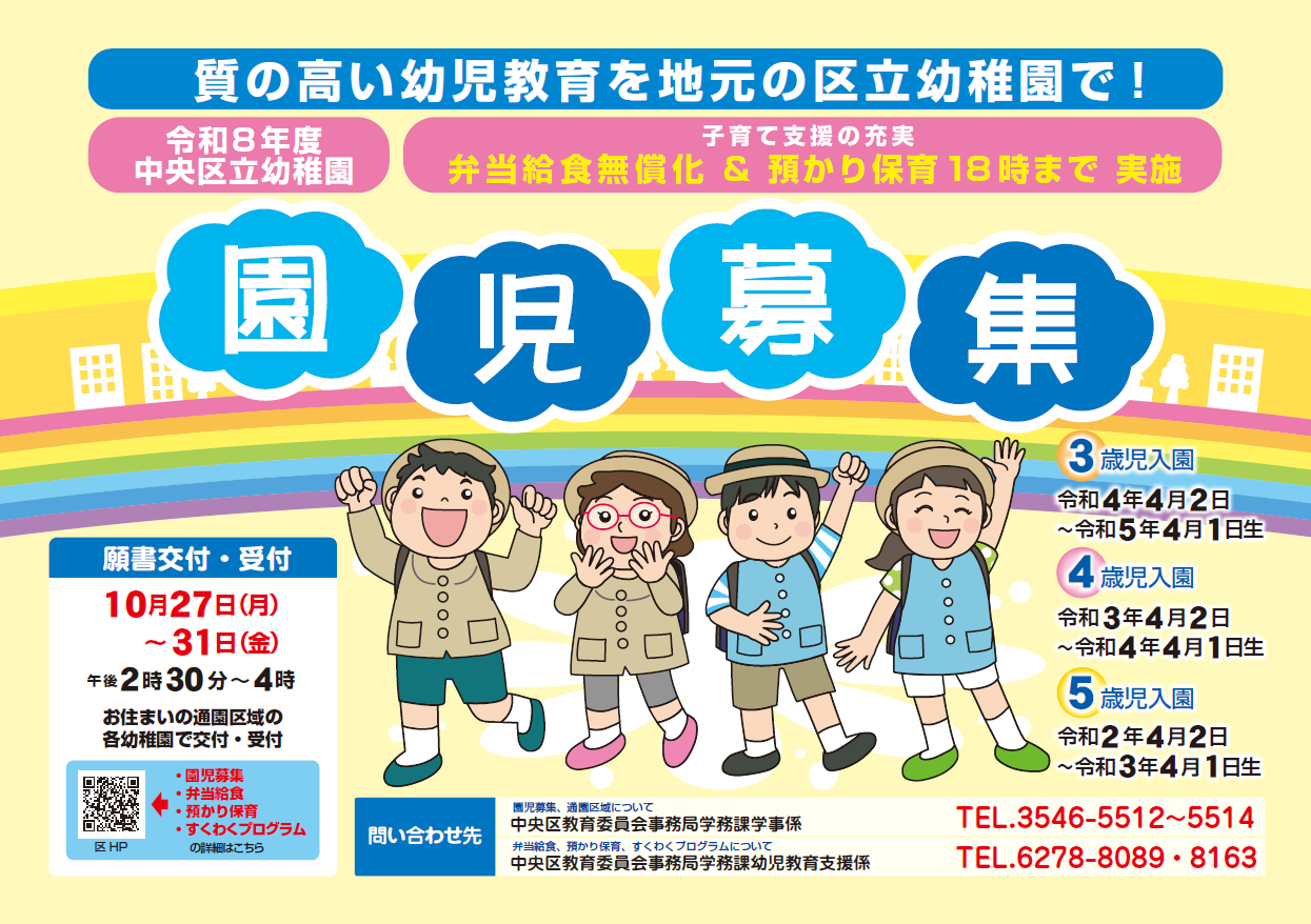 詳しくは、園児募集ポスター、中央区教育委員会学務課ホームページをご覧ください。